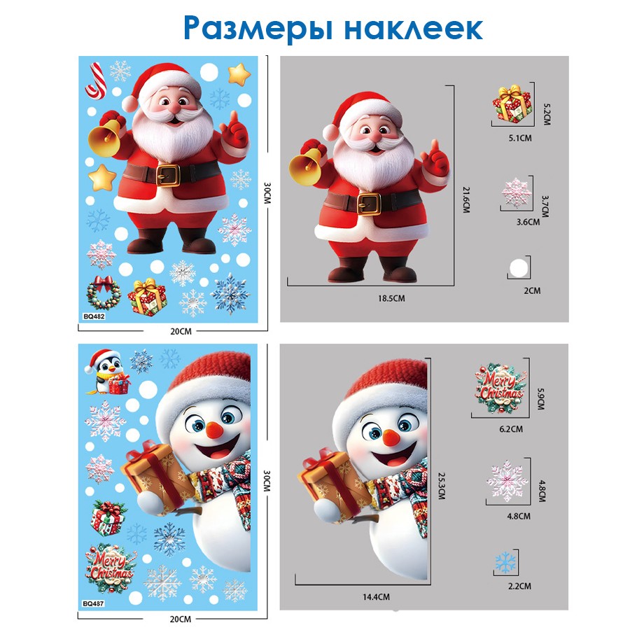 Наклейки на окна композиция "Деды Морозы и Снеговики" 119 элементов 4 листа 20*30 см. Многоразовые, Без клея (Статические) BQ482