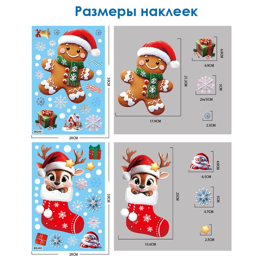 Наклейки на окна композиция "Пряник/Подарки/Олени" 119 элементов 4 листа 20*30 см. Многоразовые, Без клея (Статические) BQ481