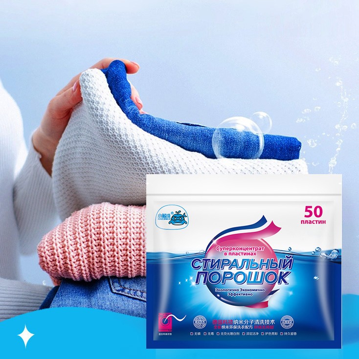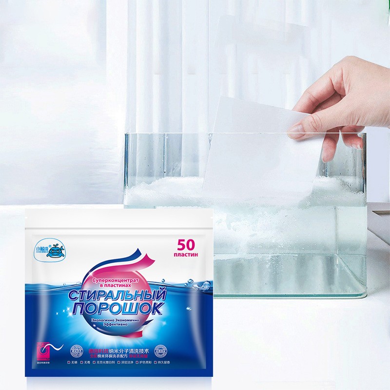 Это средство для стирки представляет собой прямоугольную пластину, пропитанную высококонцентрированным средством.
