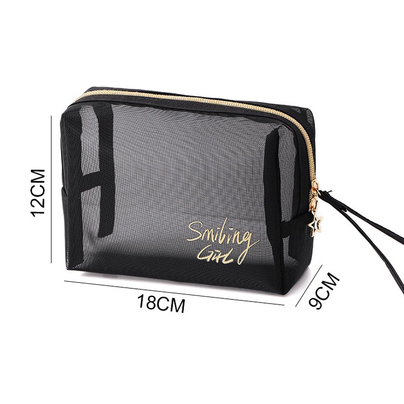 Прозрачный органайзер изготовлен из мягкой нейлоновой сетки в стильном черном цвете. Бегунок на молнии декорирован золотой звездочкой.