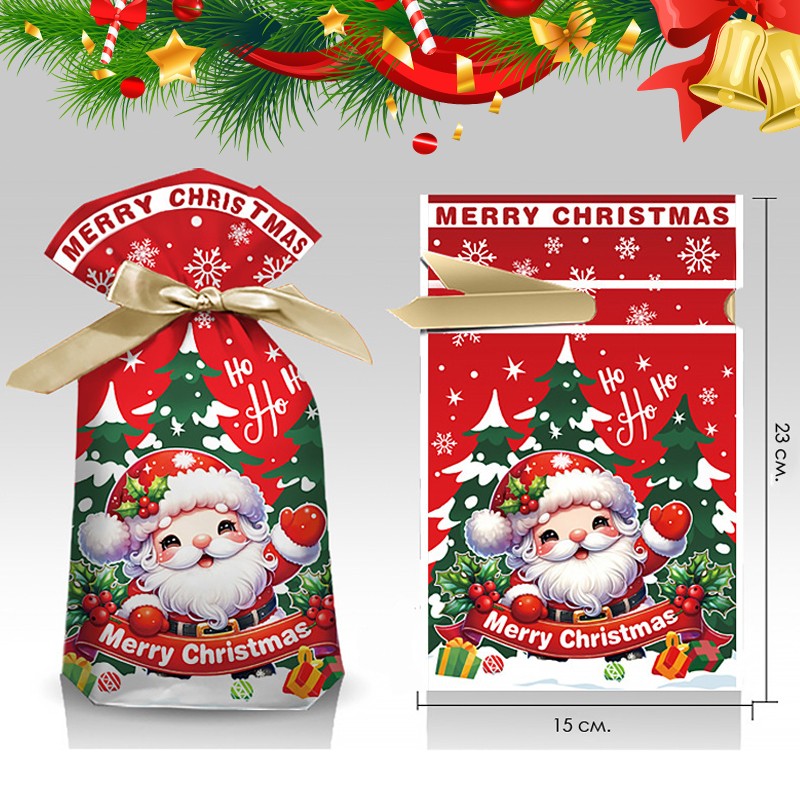 Подарочный пакет Дед Мороз отлично подойдет для упаковки печенья, конфет, сувениров, носочков, мыла, бижутерии и пр.