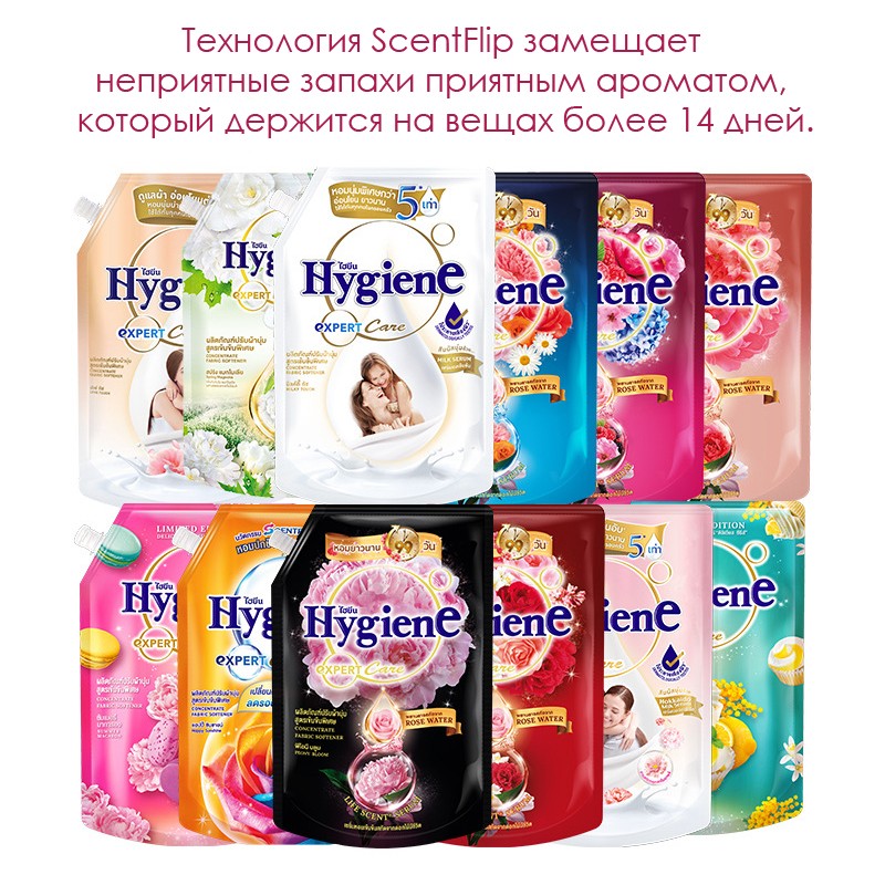 При создании кондиционера для белья Hygiene использовали инновационную запатентованную технологию: технология ScentFlip – она замещает неприятные запахи приятным ароматом, который держится на вещах более 14 дней.ней.