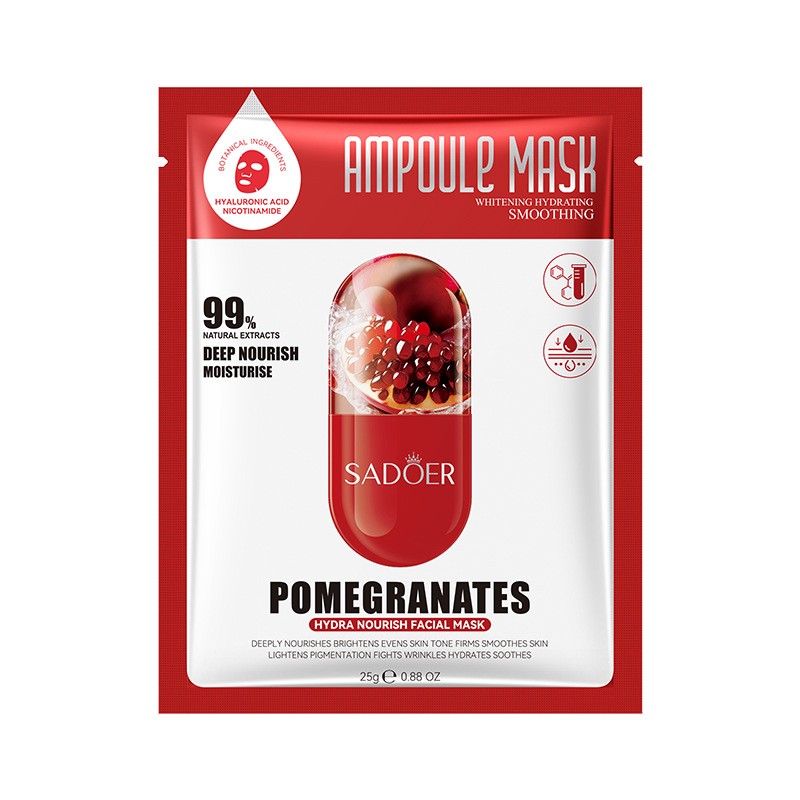 Тканевая маска с экстрактом граната, ниацинамидом, гиалуроновой кислотой и коллагеном, подарит вашей коже глубокое увлажнение, бархатную мягкость и сияющий, отдохнувший вид.