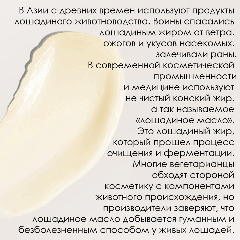 В современной косметической промышленности и медицине используют не чистый конский жир, а так называемое «лошадиное масло». Это обычный лошадиный жир, который прошел процесс очищения и ферментации. Многие вегетарианцы обходят стороной косметику с компонентами животного происхождения, но производители заверяют, что лошадиное масло для лица добывается гуманным и безболезненным способом у живых лошадей.
